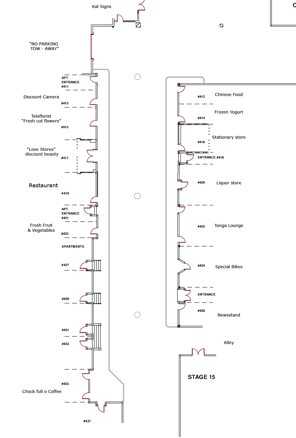 While most storefronts are generic, there is a bicycle store, "Special Bike Shop", which stocks and promotes only Specialized brand bicycles. A bicycle seen in the front window of the shop was later placed in George's Apartment in “The Postponement”. The store's street address is 426, and the store's hours are 8am to 5pm Monday through Friday, 10am to 2pm on Saturdays.