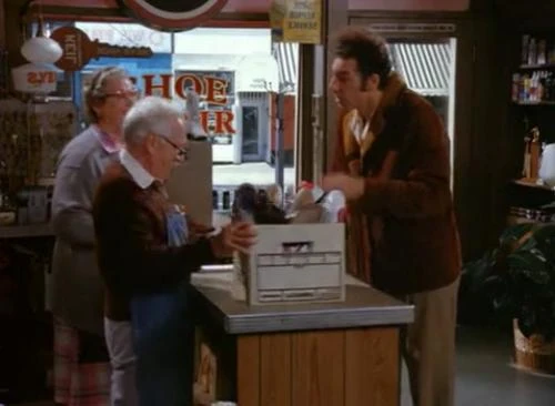 “The Mom and Pop Store” is the 91st episode of Seinfeld. It is the eighth episode of season six and originally aired November 17, 1994. It is directed by Andy Ackerman and is written by Tom Gammill & Max Pross. The title characters of "Mom" and "Pop" are played by Elsa Raven and Michael Robello. Jon Voight has a cameo appearance as himself.