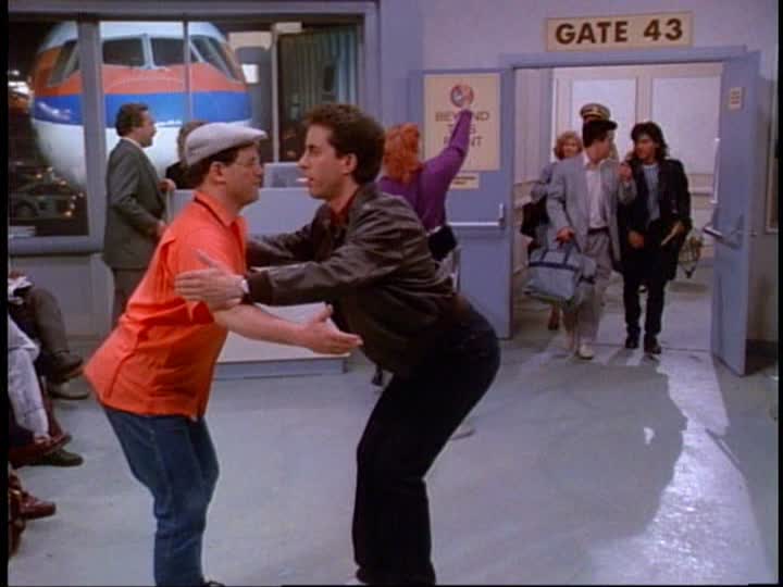 Jerry and George discuss the "shoulders touching, hips eight feet apart" greeting hug.
